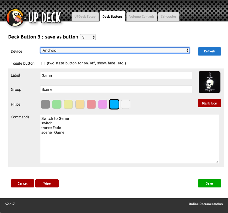 When setting up button actions, the app goes OFFLINE, so remember to reconnect again when finished by pressing the top left button on the main screen. As an example, we will program a button to switch to a scene named 'Game' using the 'Fade' transition. Pick any deck button then press and hold until the button setup screen appears.