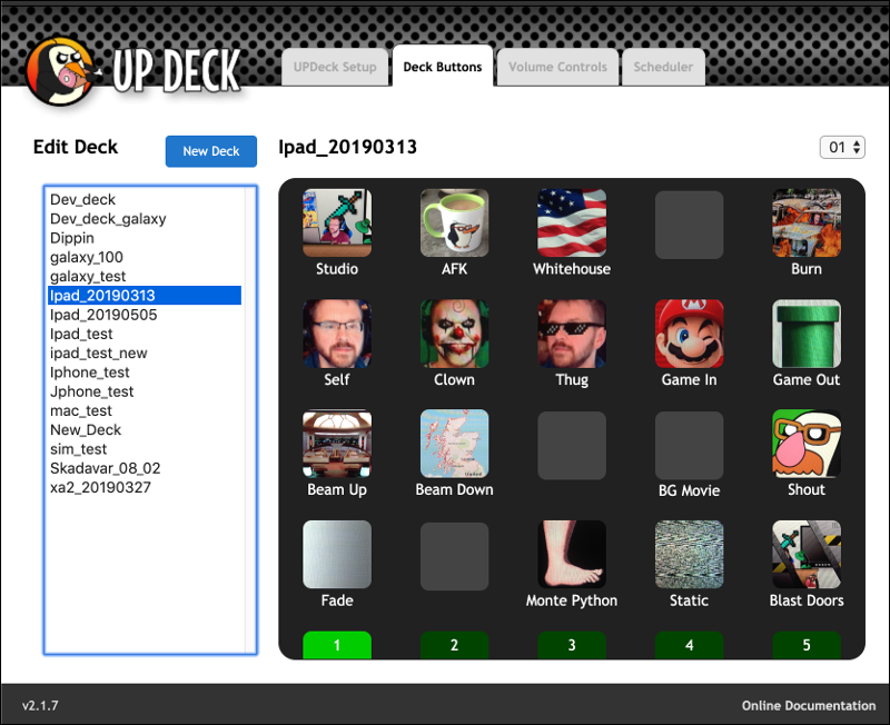 The deck has 25 banks of 20 buttons. The screen can be swiped left and right or you can use the 5 bank (page) buttons at the bottom of the screen to quickly jump to banks 1 - 5.