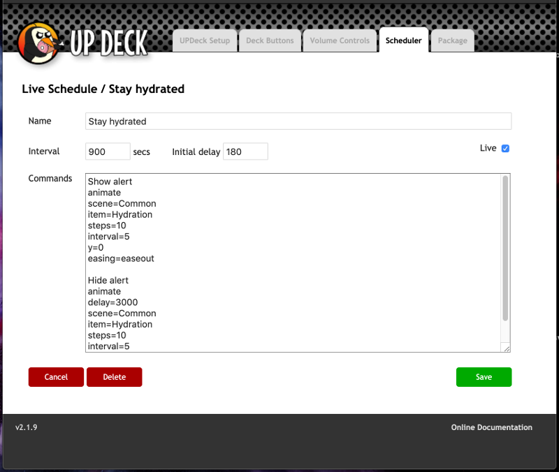 In the example below, I've set up a job to run every 15 minutes (900 seconds). The initial delay is how long to wait before the job runs for the first time - 3 minutes in this case (180 seconds). You could also set up a job to run just once by setting a huge interval (like '99999') and set the initial delay to how far into your stream you want it to run. Use the 'live' checkbox to make the job active or inactive and enter the commands to run in the normal way. I've set a notice to animate on screen then move off screen after a 3 second delay.