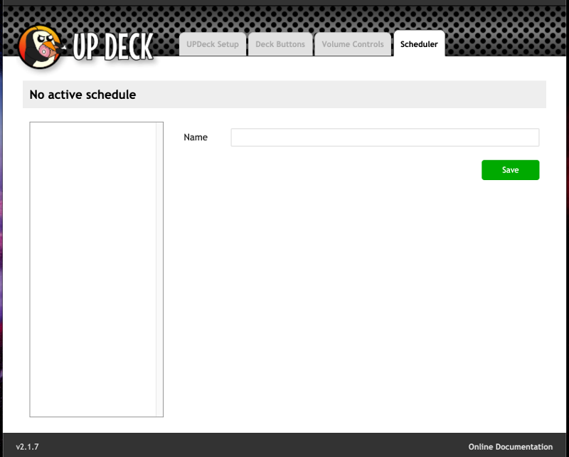 The scheduler allows you to set up reminders or repetitive tasks such as remininding you to stay hydrated or showing a sponsors ad every so often. To get started, just enter a name for the schedule (alphanumeric and spaces only) then click 'Save'