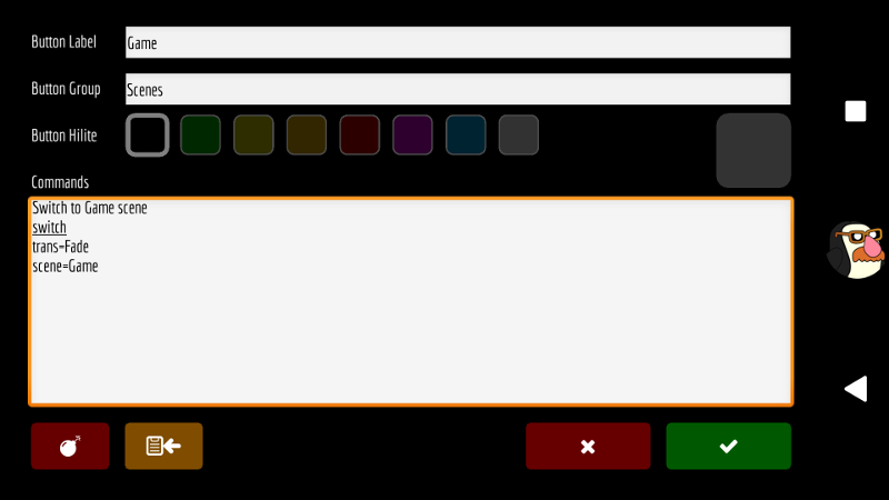 You can create toggle buttons to give on/off functionality by using the special group * (asterisk) when configuring the button. When editing on desktop, selecting a button to be a toggle button automatically assigns the special group. When editing on mobile, you must assign the group manually by entering * in the group text box. Once set, the button has two states and pressing it toggles between them. To configure each state, simply press the button until it is in the state you wish to configure, then press and hold until the button setup screen appears. Each state has it's own unique configuration, including hilite color and icon.
