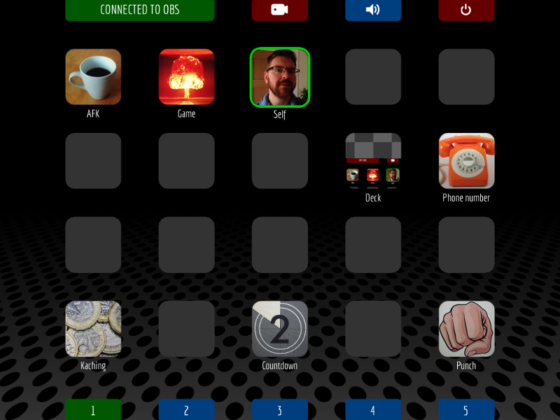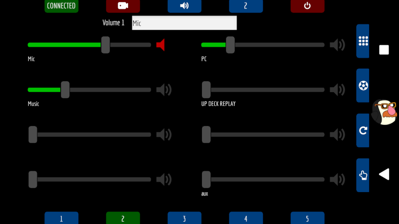 The third button along the top of the screen shows and hides the panel to control volume and muting. To configure a volume control, press and hold its mute icon until a text box appears at the top of the screen. Type the name of the audio source into the box - exactly as it appears in OBS (case sensitive). Once complete, sliding the volume control up and down should change that audio source's volume in OBS.