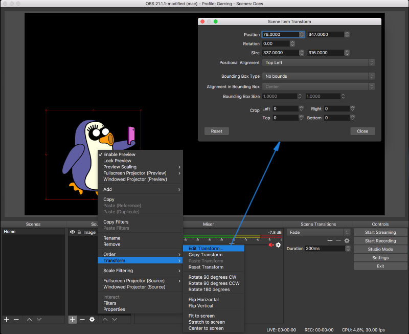 This is an extension to Animating_objects : moving_resizing_rotating, so check out that page first! From version 2.0.3 of the Lua script, filters properties can be animated, which opens up some new and interesting possibilites. The video example uses the excellent stream effects plugin.
