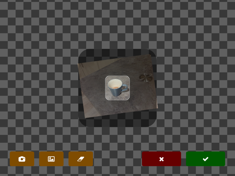 The amber buttons at the bottom of the screen allow you to take a picture with the device camera, select an image from the photo library or clear the image you are currently working with. Once you have an image on screen, you can pinch zoom and rotate it until the icon viewfinder contains the image section to use on the button. Another easy way to source images for creating icons is to search the web on your PC, find an image you like, then take a picture of the PC screen. Press the green save button to assign the icon to the button.