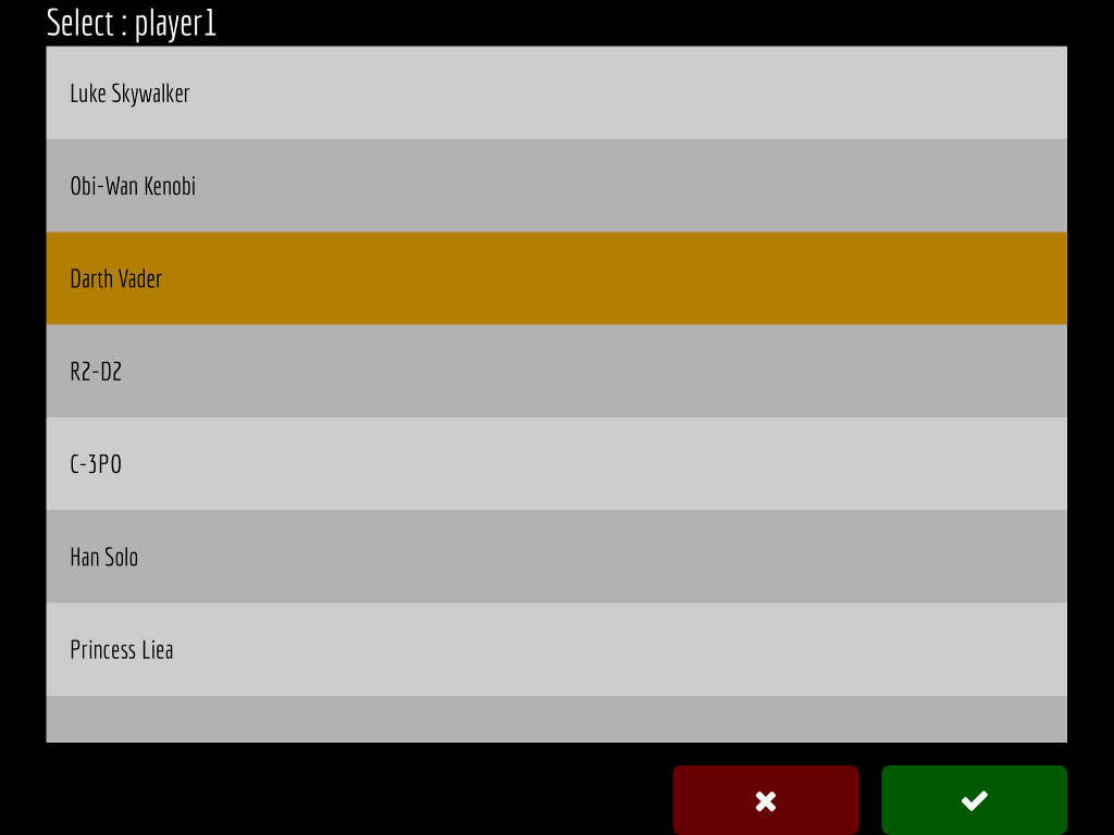 Get characters from the list input *list=StartWars player1=list player2=list |