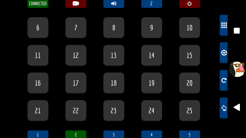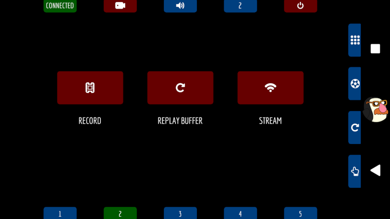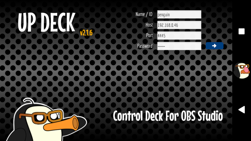After launching the app on your device, enter a name to identify your device into the Name / ID text box. This name will identify which device is to be updated when you edit buttons using the browser UI. Next, enter the IP address of the machine running OBS into the Host text box. The Port and Password inputs are the values that you set up in the desktop app previously. After entering the required info, press the blue button to continue...