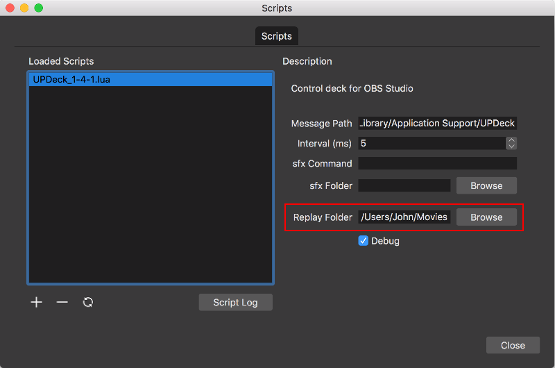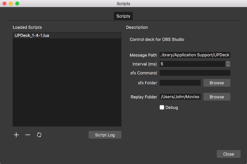 Download the Lua script UPDeck_2-1-19.lua and then load it into OBS from the following menu : OBS -> Tools -> Scripts