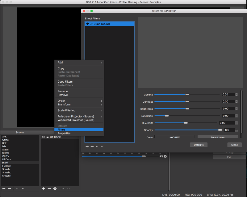 Setting Opacity : If you are setting the opacity of any objects then you must create a special object called UP DECK. It can be any type of object - a Color Source for example. It can also be created in any scene - as long as it exists somewhere in OBS - it can even be invisible. You then must add a Color Correction filter to this special object : rename the filter to UP DECK COLOR. After this special object and filter have been created, you can set the opacity of any object in any scene.