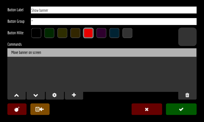 Enter the button label - this will be displayed under the button on the main screen. If you enter a button group then this button will become a member of that group. When a grouped button is pressed, it is hilited with the color selected. Only one button in a group can show it's hilite color, so you can always tell which button in the group was pressed last. You can add multiple commands (actions) to a button by separating each one with a blank line.
